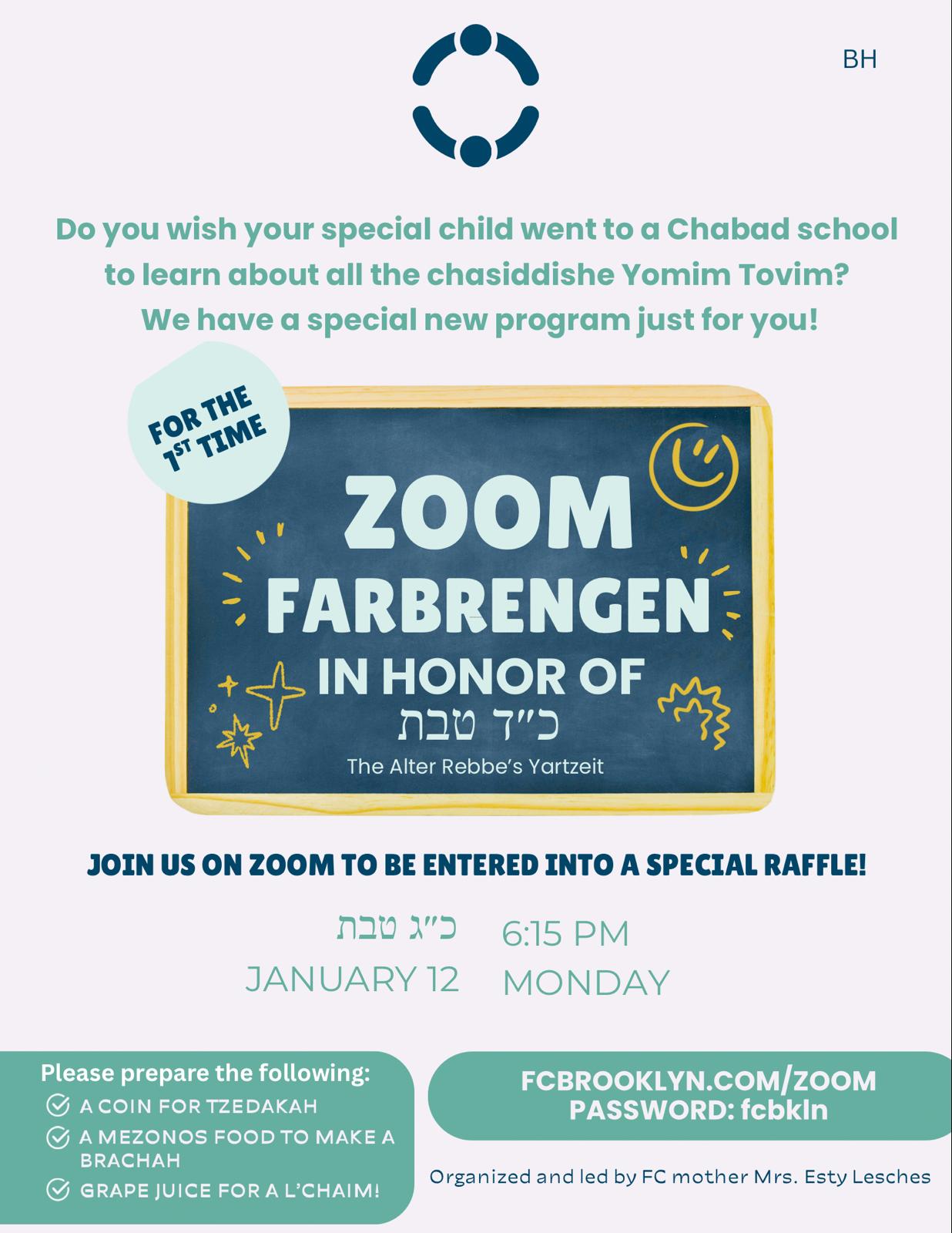 New program in honor of Chof Daled Teves This zoom farbrengen, which will be led by FC mother Mrs. Esty Lesches, will bring the Chassidishe Yom Tov down to your...