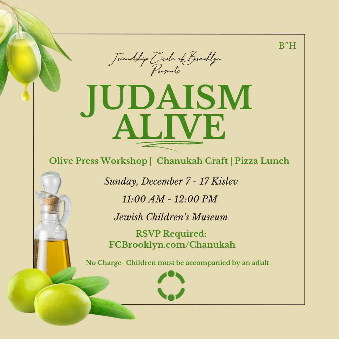 Friendship Circle Brooklyn Presents: Judaism Alive! Olive Press Workshop Chanukah Crafts | Pizza Lunch For preschool and elementary-aged children with special needs and their siblings By registration only.