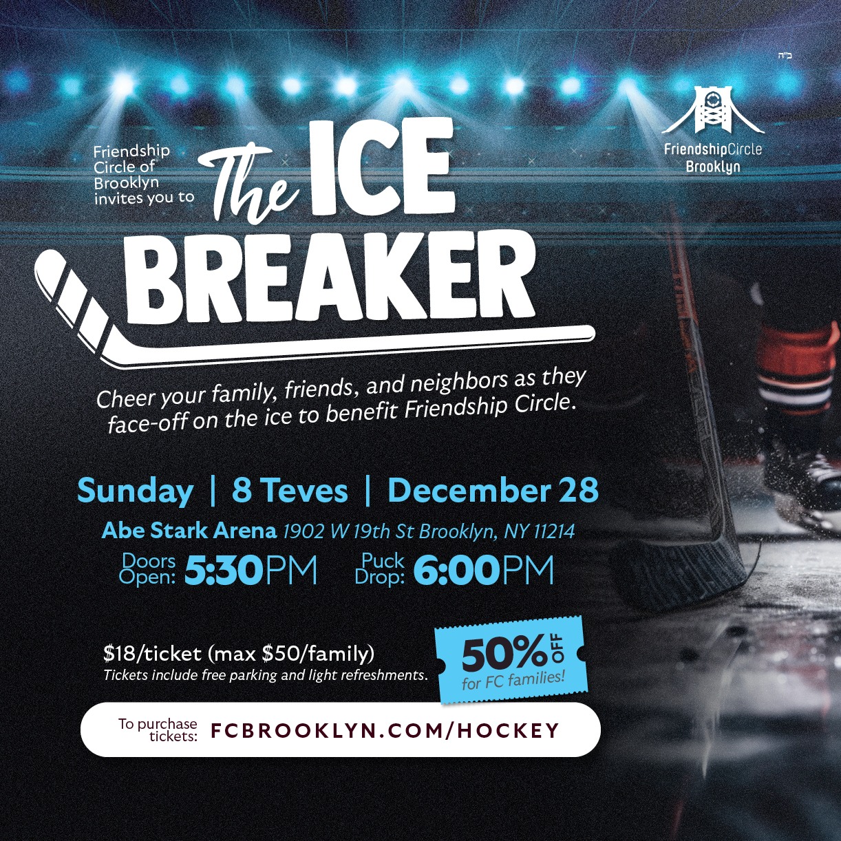 Cheer your family, friends, and neighbors as they face-off on the ice to benefit Friendship Circle. Ticket includes free parking and light refreshments. Public transportation is available right near the arena....