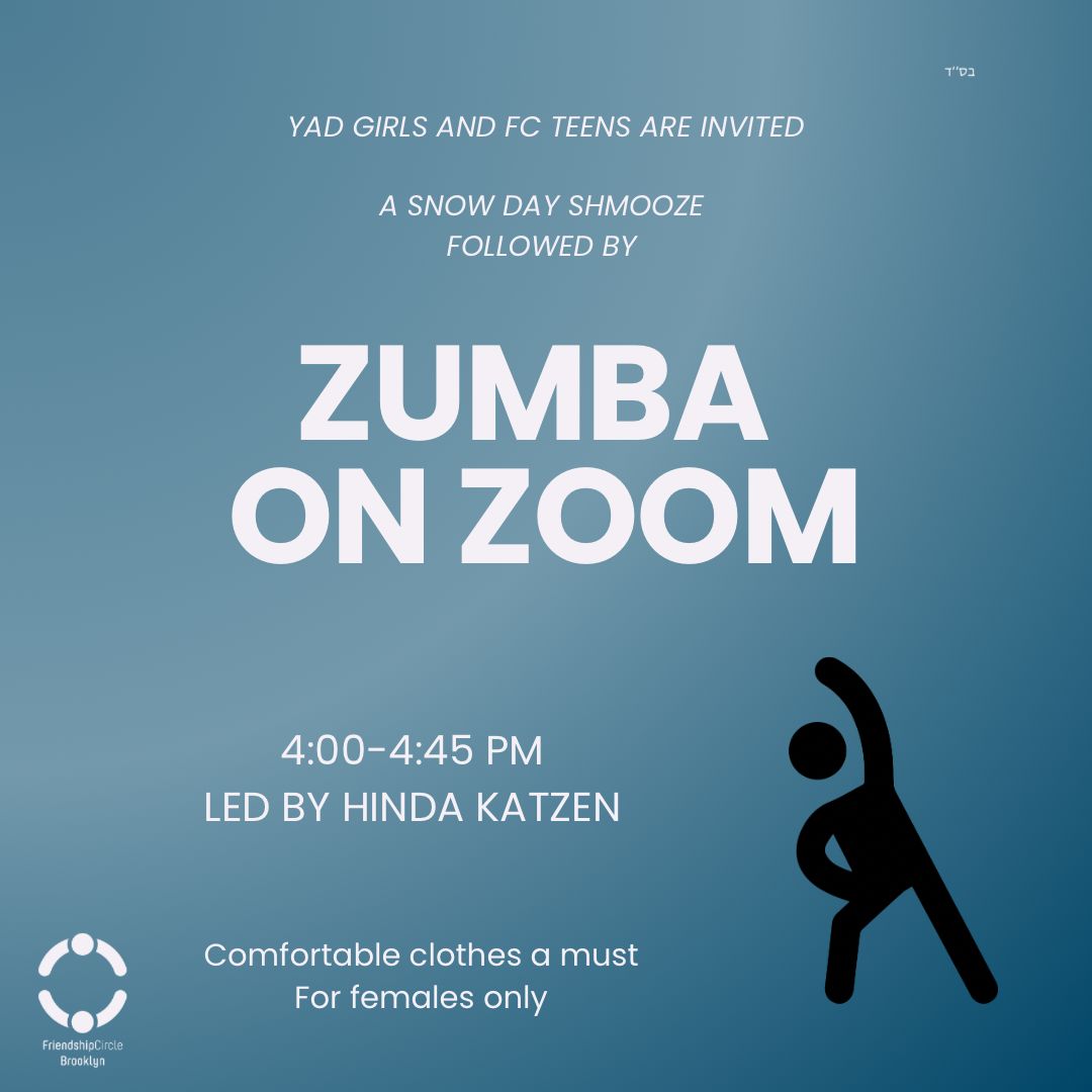 The Friendship Circle of Brooklyn- Young Adult Division invites you to the third annual ZUMBA Recital on Motzei Shabbos, Jan. 16th from 8.00-9.00pm. Culminating nine weeks of exceptional ZUMBA and...