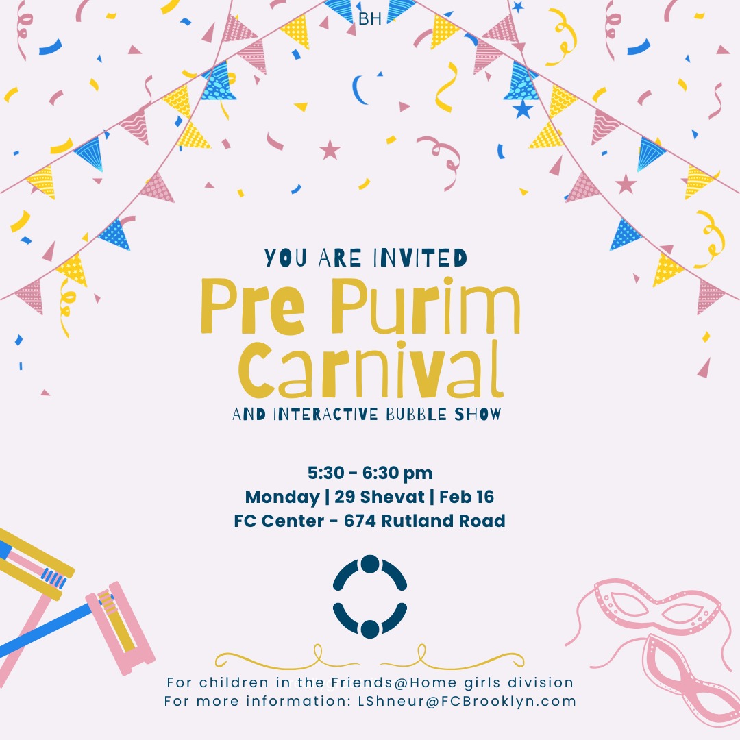 Friends at Home girls division is invited to a fun Pre-Purim carnival!