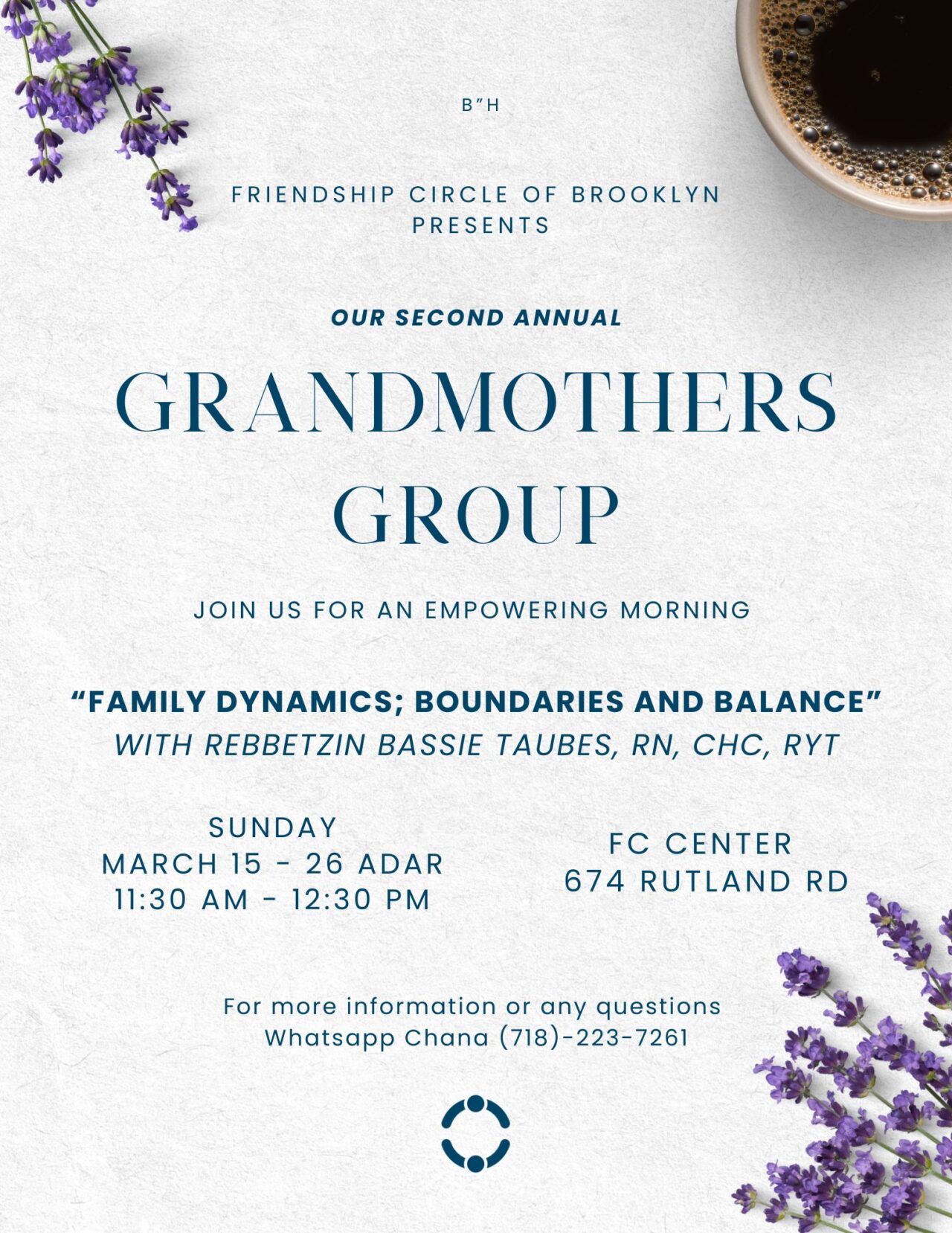 Join us for an empowering morning: “Family Dynamics; Boundaries and Balance” with Rebbetzin Bassie Taubes, RN, CHC, RYT