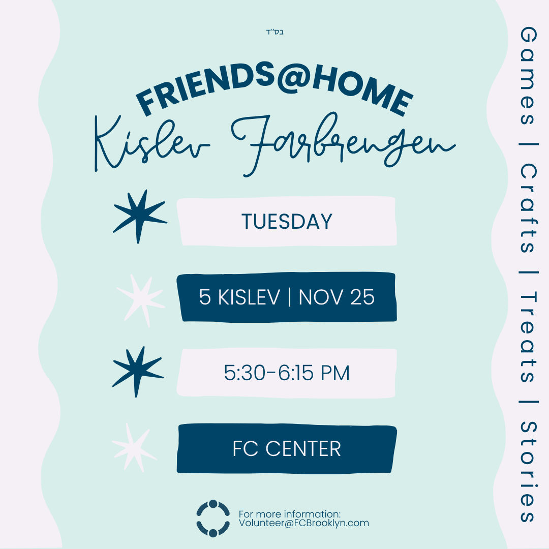 Friends at Home (Girls Division) participants are invited to a Kislev Farbrengen! For more information: Volunteer@FCBrooklyn.com