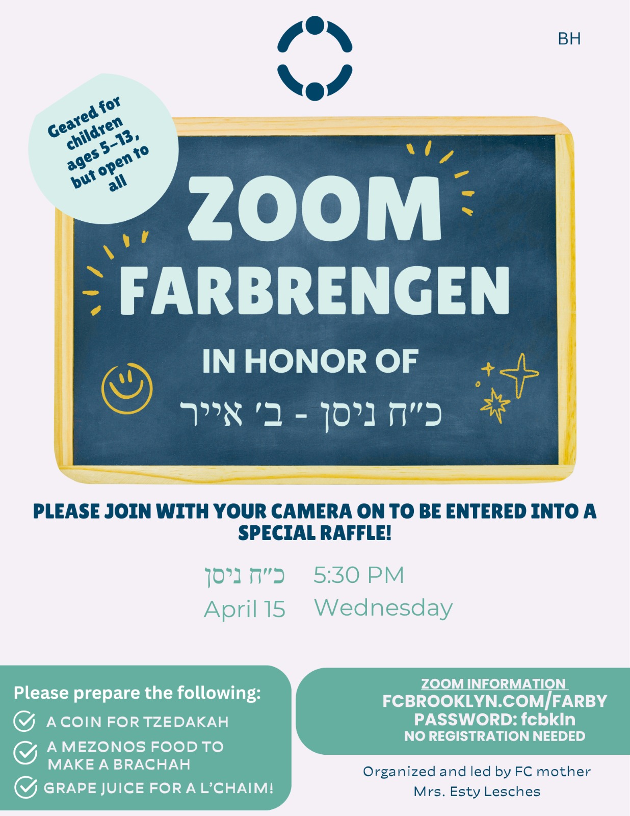 Children ages 5-13 are invited to a zoom farbrengen in honor of Chof Ches Nissan and Beis Iyar.