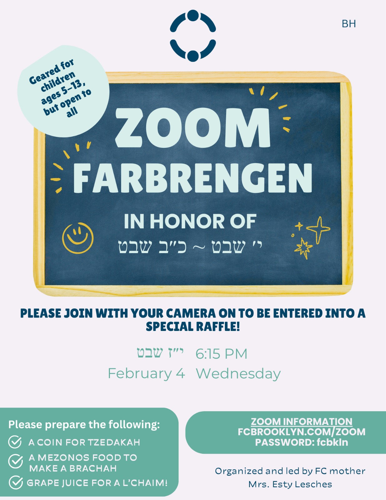 This zoom farbrengen, which will be led by FC mother Mrs. Esty Lesches, will bring the Chassidishe Yomim Tovim down to your child’s level.