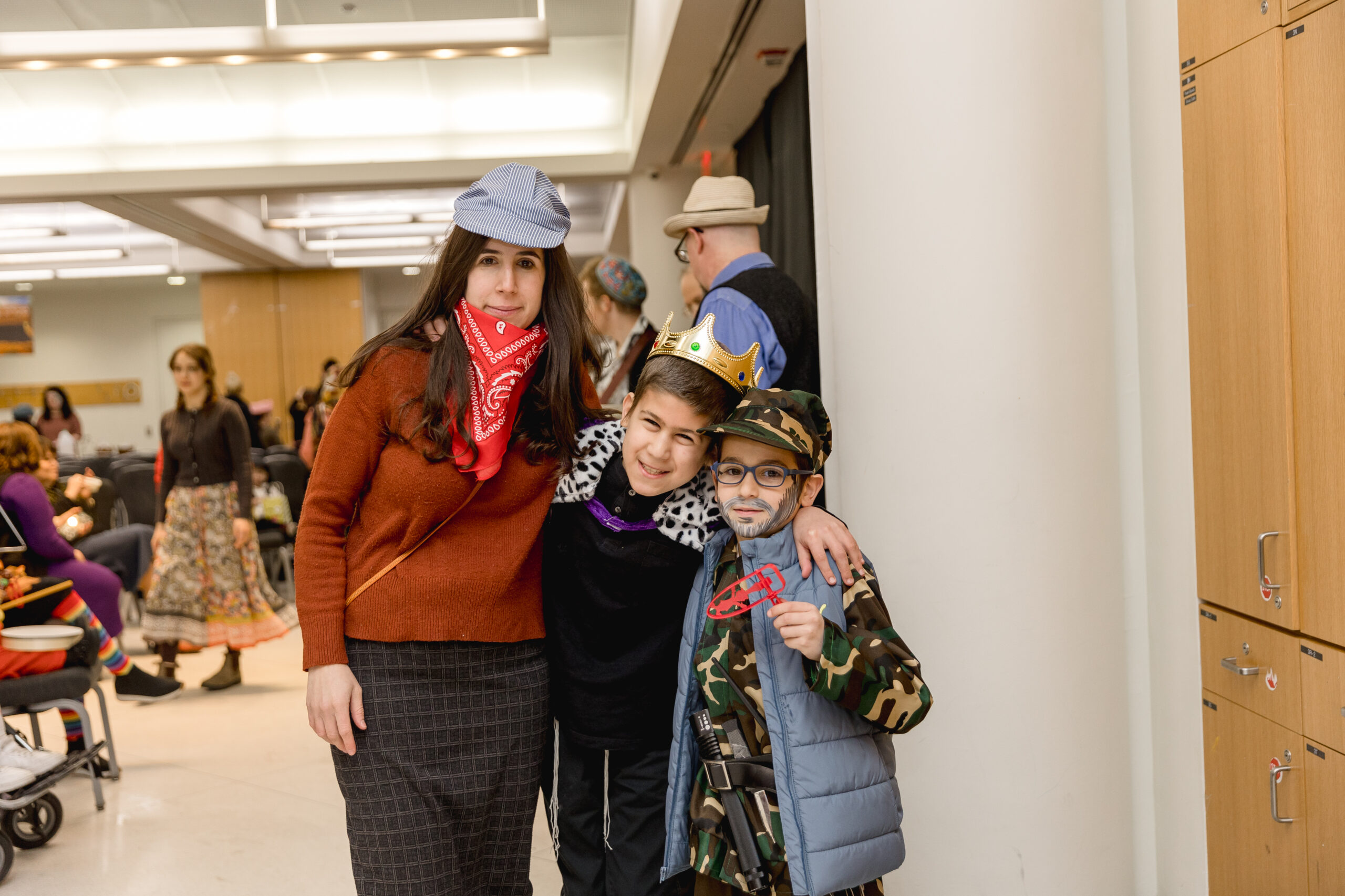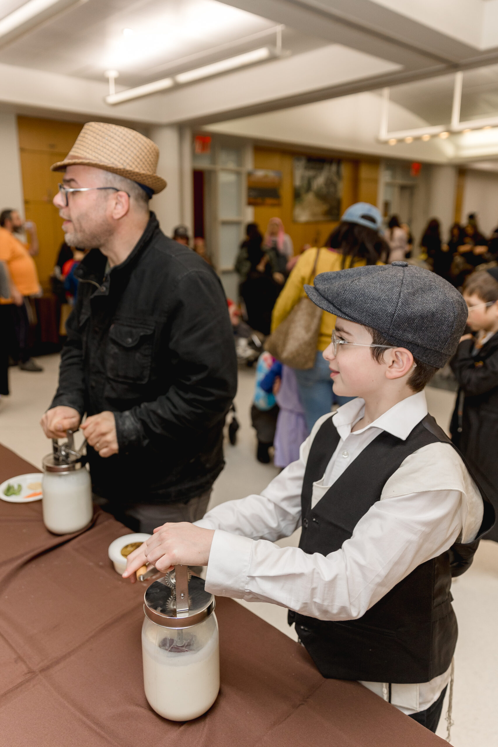 Children had the opportunity to pet baby chicks, enjoyed listening to a klezmer band playing upbeat tunes, made their own pickles, butter, orange juice, and babka! After hearing Megillah, children were handed instruments, and the klezmer band taught everyone how to play a few Purim songs.