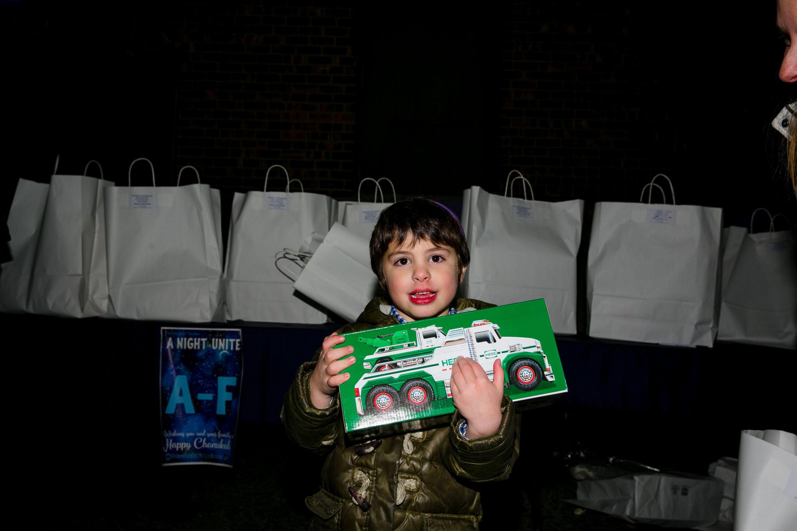 As the evening ends, families make their way to tables filled with white paper bags filled with toys and gifts. Every single toy has been purchased from FC’s Toy Drive.