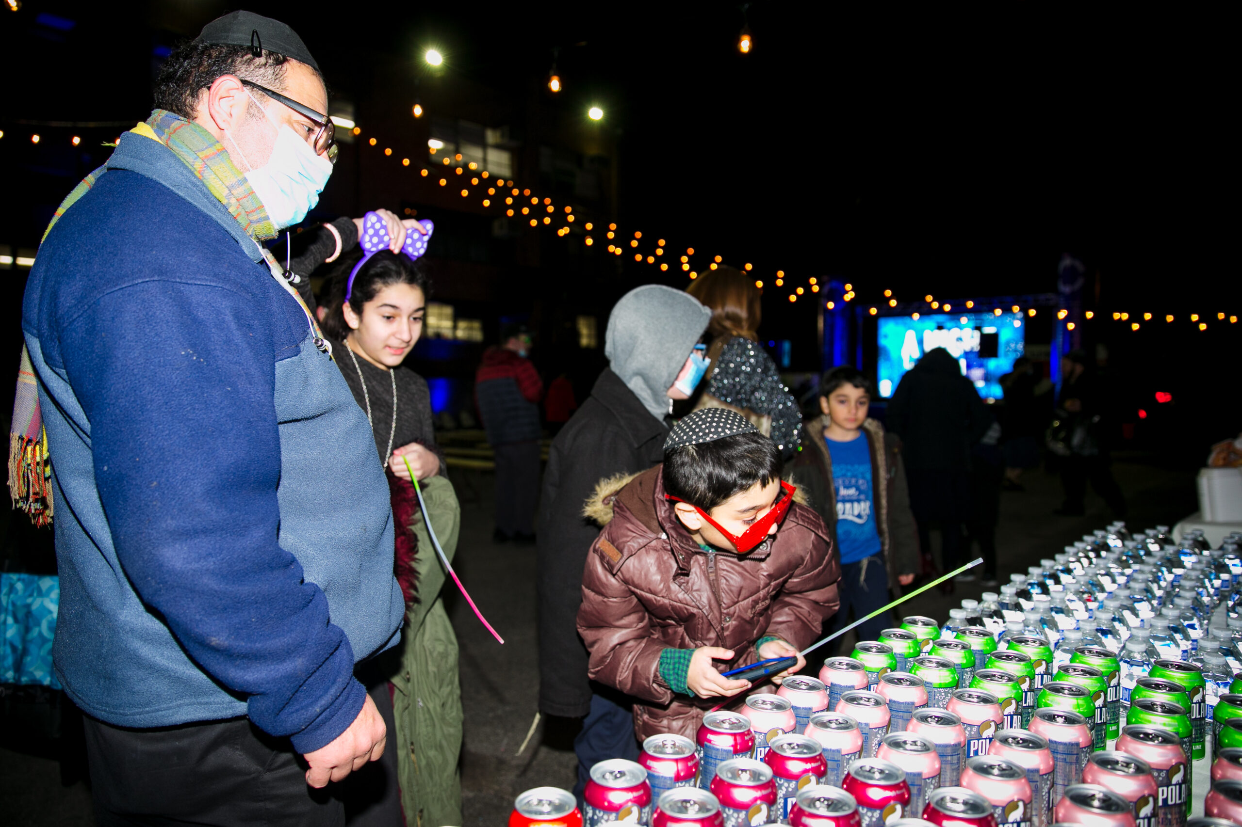 Food… it’s not Chanukah without it! FC added something new to their Chanukah party menu to keep everyone warm – a hot apple cider bar with a wide array of toppings and additions to choose from! Orders are placed for over 550 latkes and donuts each, tons of cases of water bottles and seltzer cans, hundreds of paper goods, and gallons of apple cider. More orders go out for hundreds of fun light-up headbands, glasses, and necklaces; over 700 custom FC neck gaiters and 250 crisp dollar bills for Chanukah gelt.