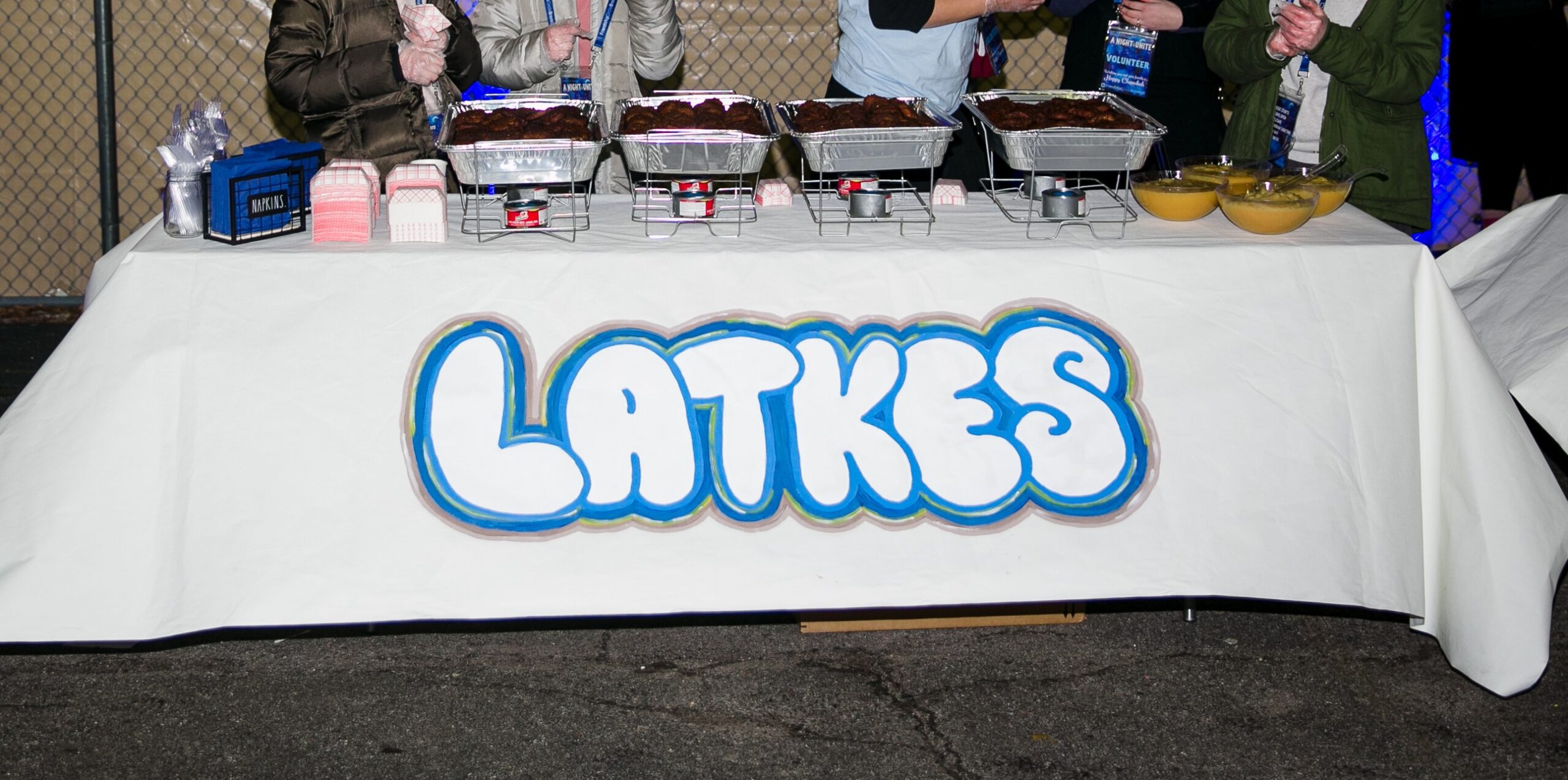 T-1 hour to start. Arches are up, tables are set, piled with goodies. Cider is heating up in giant urns, latkes are in their warming pans and donuts are getting arranged beautifully. Stage is set up with giant pillars flanking the sides, the Menorah stands proudly in the spotlight. The Zikron Digital team is manning the sound and lighting system, making sure everything is good to go.