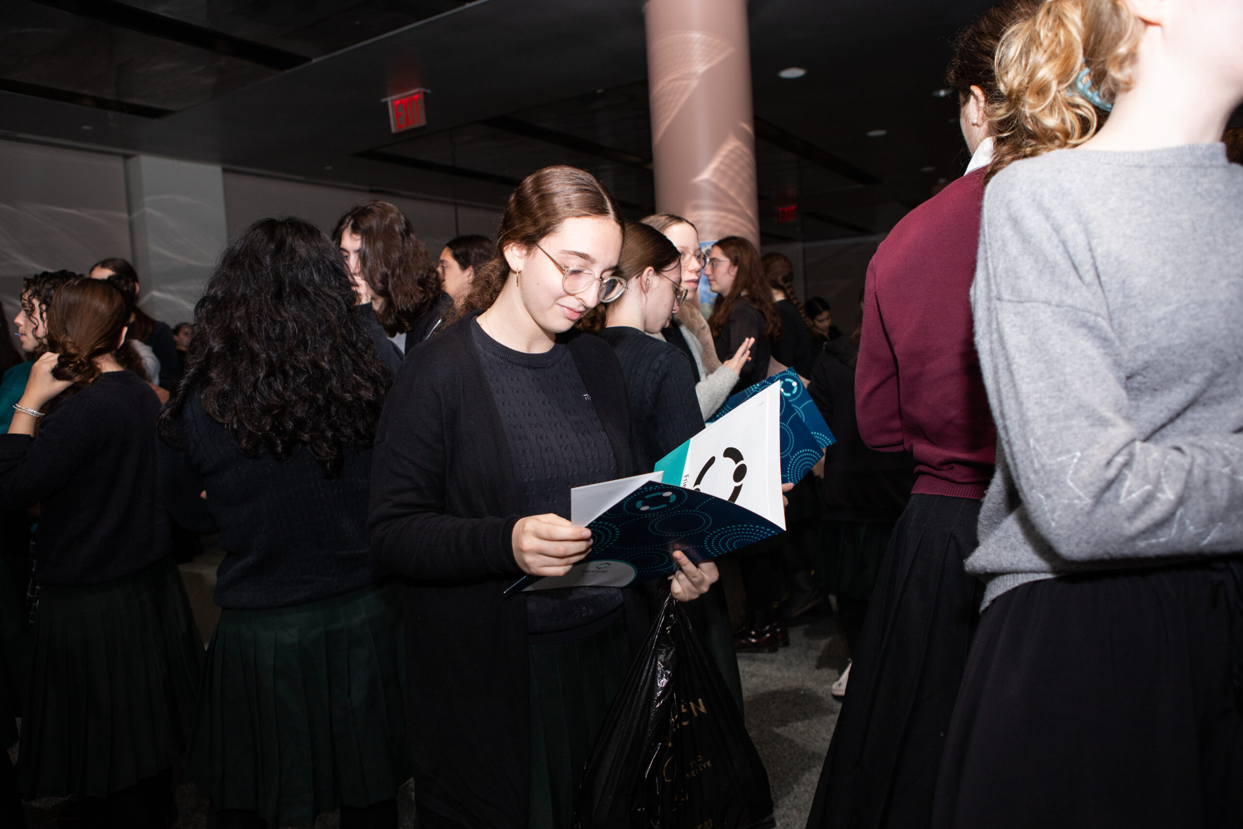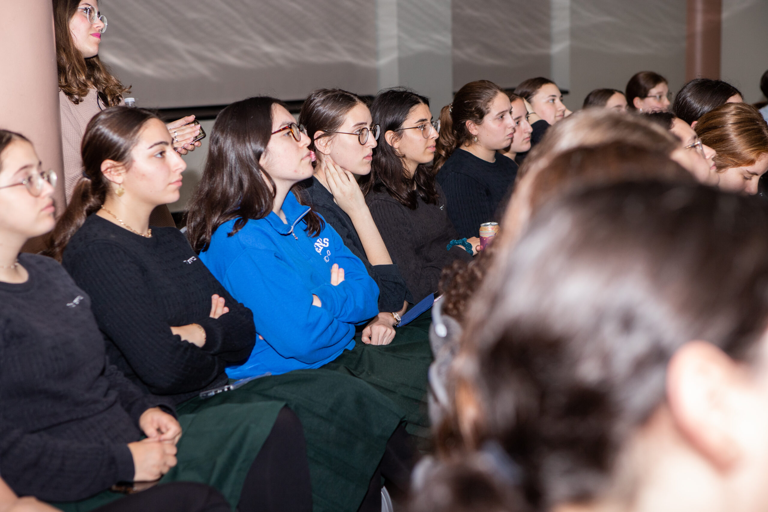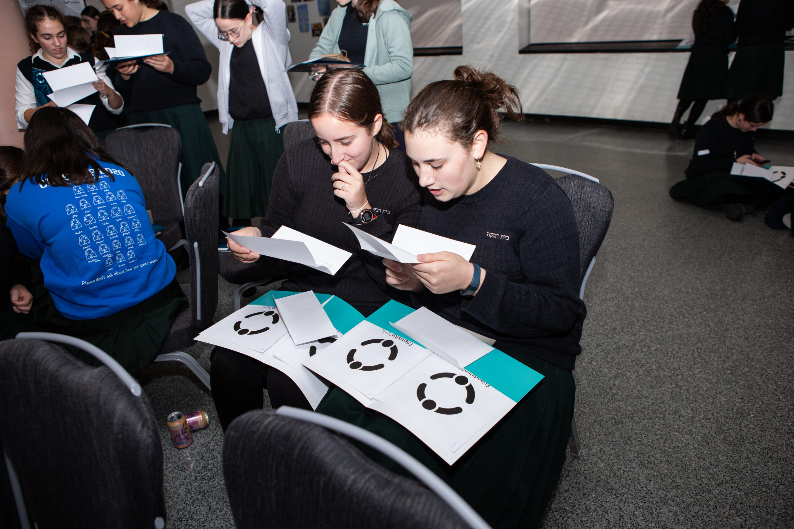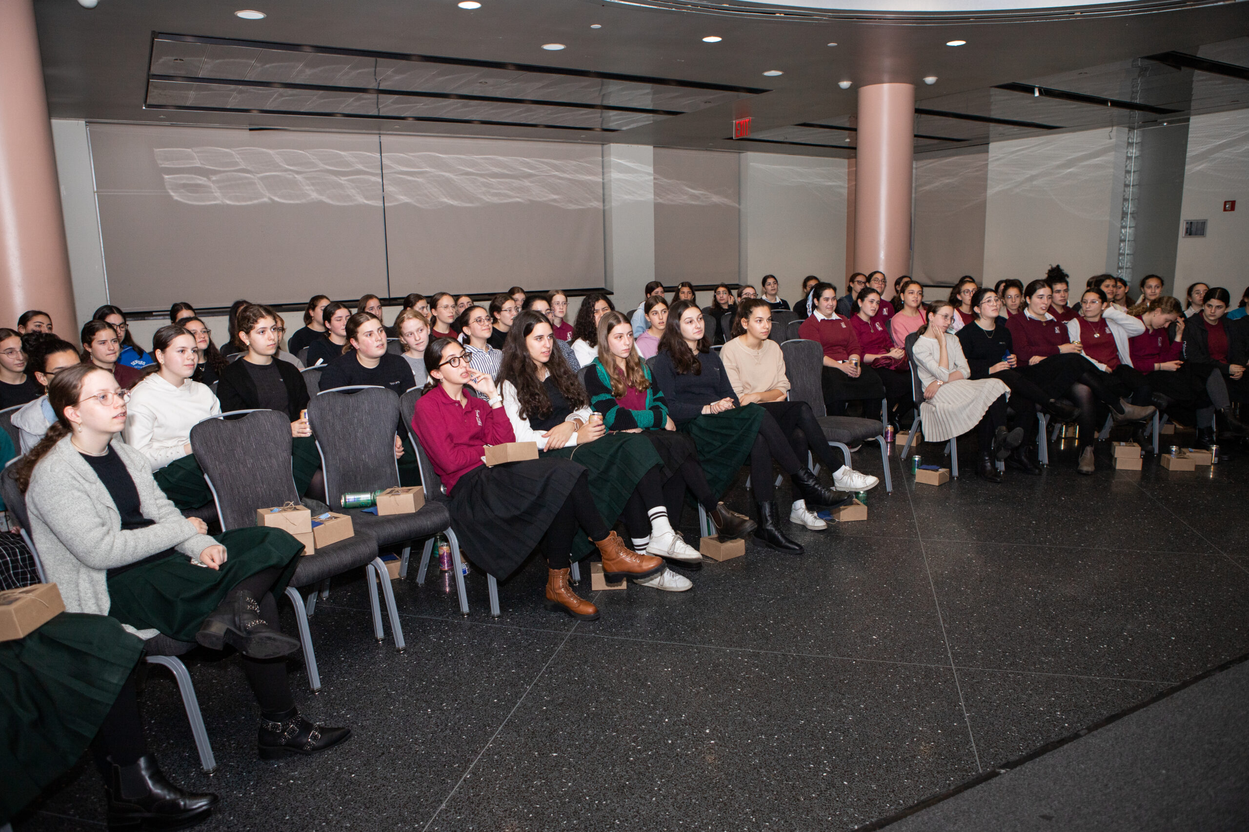 After taking a moment to catch up with their peers, the volunteers heard from Friendship Circle parents Mrs. Tanya Rogalsky and Mrs. Fruma Gajer (in a panel moderated by Rochel Karp) all about the crucial role the volunteers play in the Friends at Home program. They imparted some helpful tips before the girls go out on their first visit. Volunteer Coordinator, Sarah Hodakov, addressed the crowd on the importance of responsibility, communication and safety, before showing a moving clip, “That Annoying Kid.”