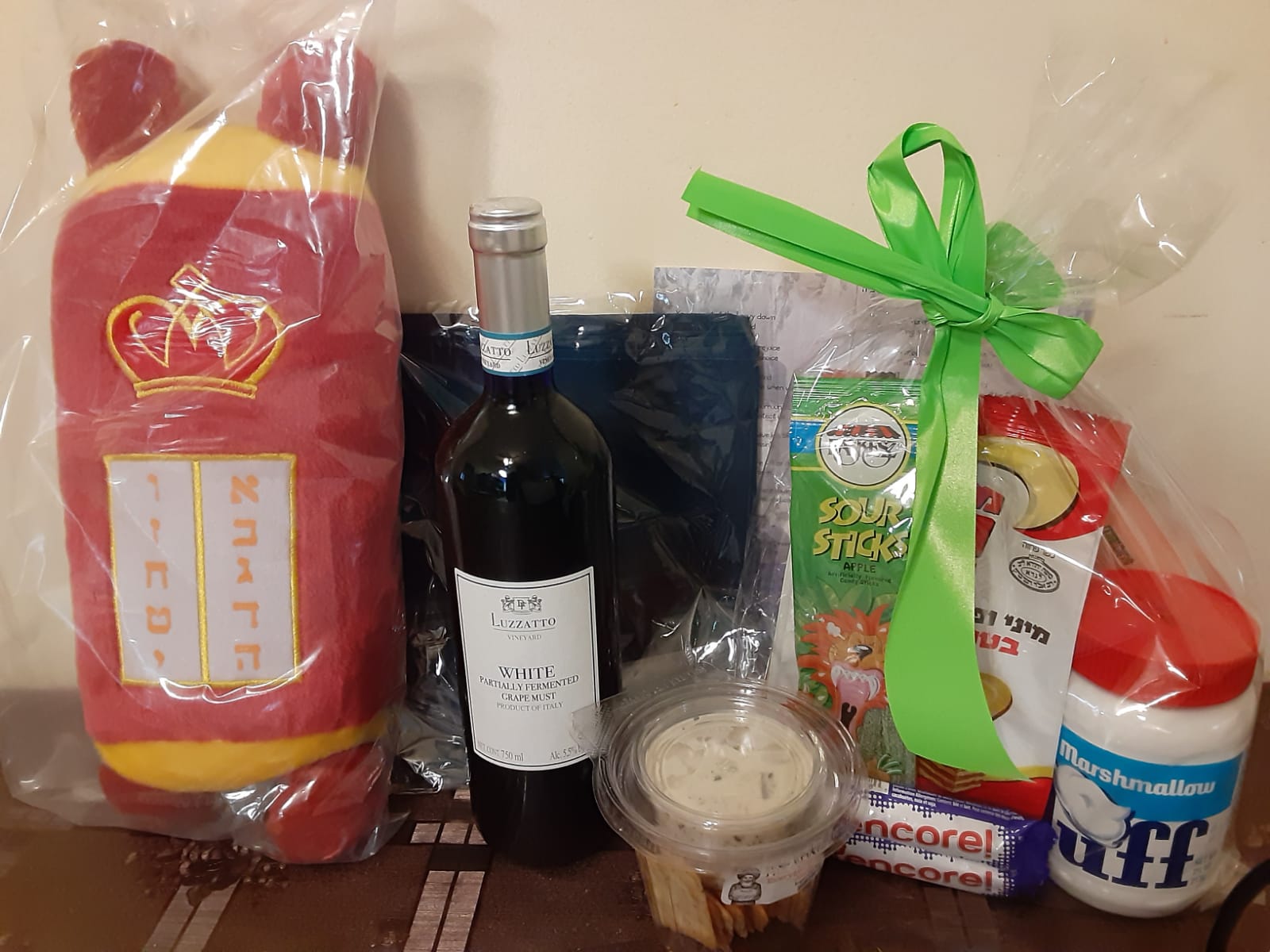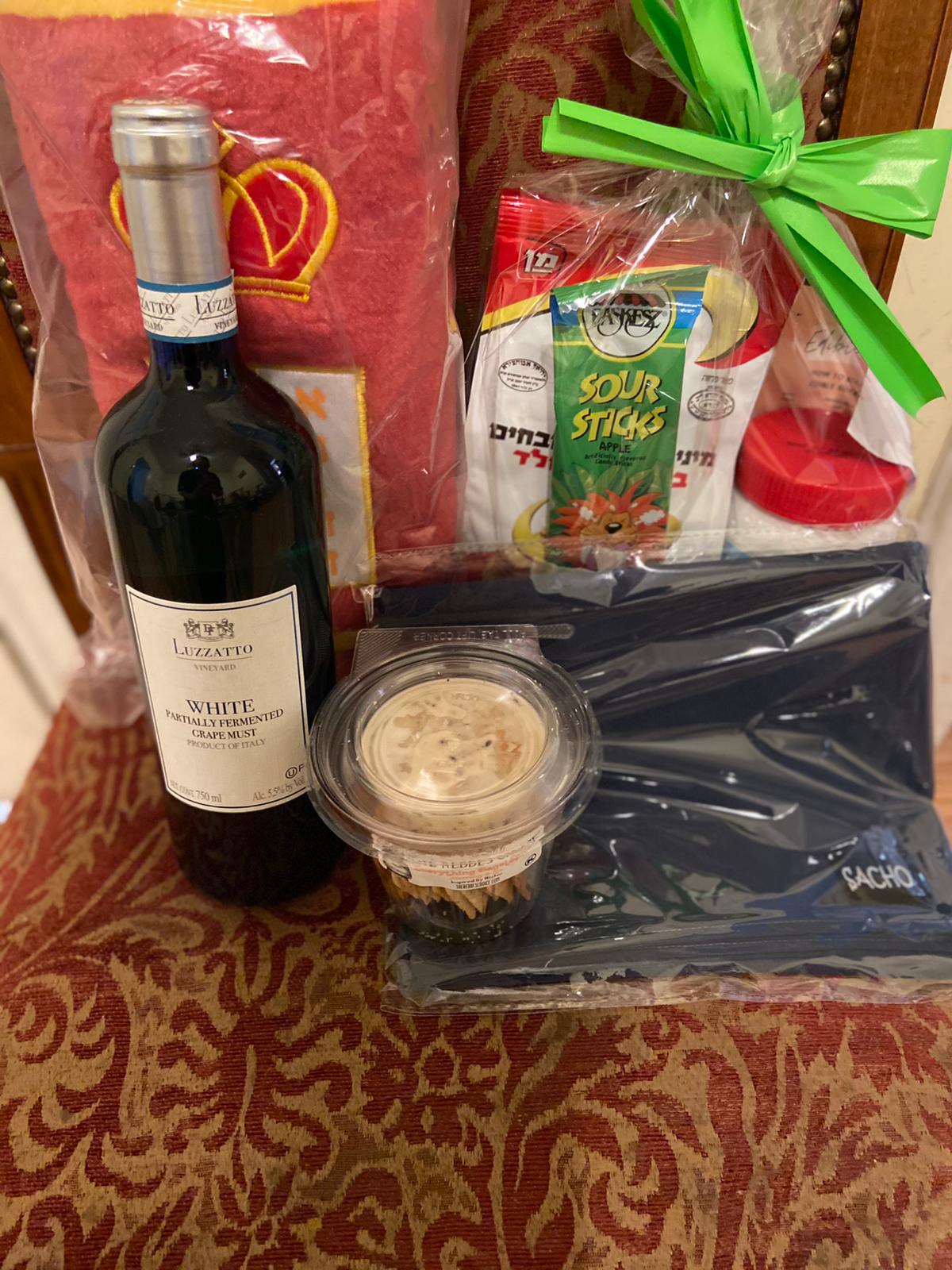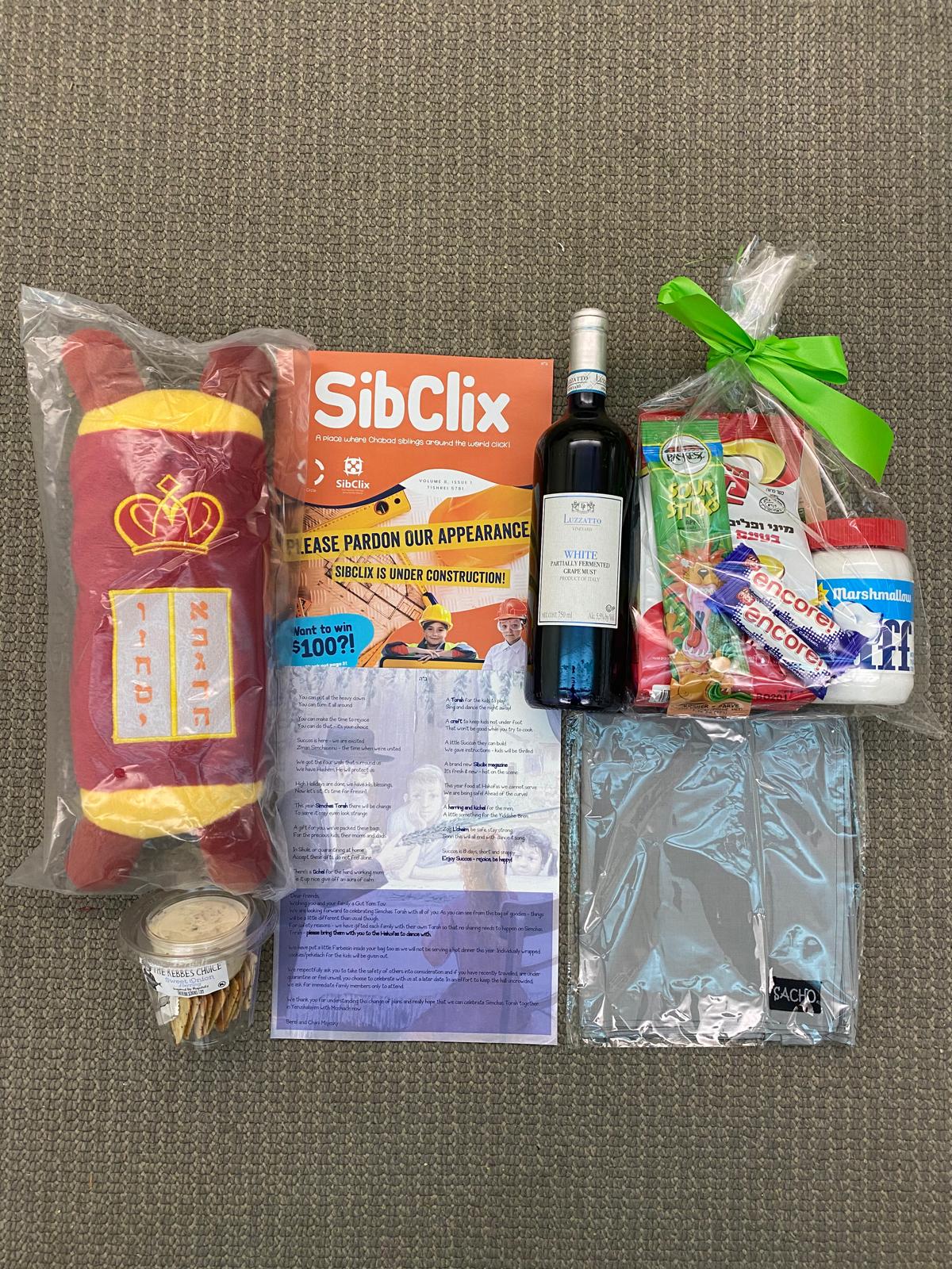 A tichel for the hardworking mom, FC’s monthly SibClix magazine (a unique magazine for siblings of children with special needs), a plush Torah to dance with on Simchas Torah, Rebbe’s Choice Herring and crackers for some farbeisin, a Build-your-own-Sukkah food craft for the kids, and wine for Kiddush and L’Chaim!