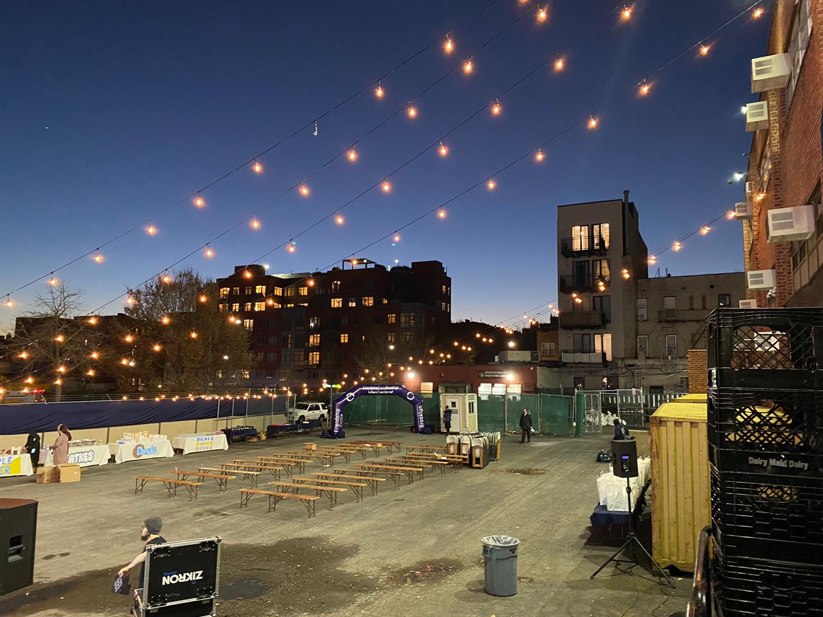 T-1 hour to start. Arches are up, tables are set, piled with goodies. Cider is heating up in giant urns, latkes are in their warming pans and donuts are getting arranged beautifully. Stage is set up with giant pillars flanking the sides, the Menorah stands proudly in the spotlight. The Zikron Digital team is manning the sound and lighting system, making sure everything is good to go.