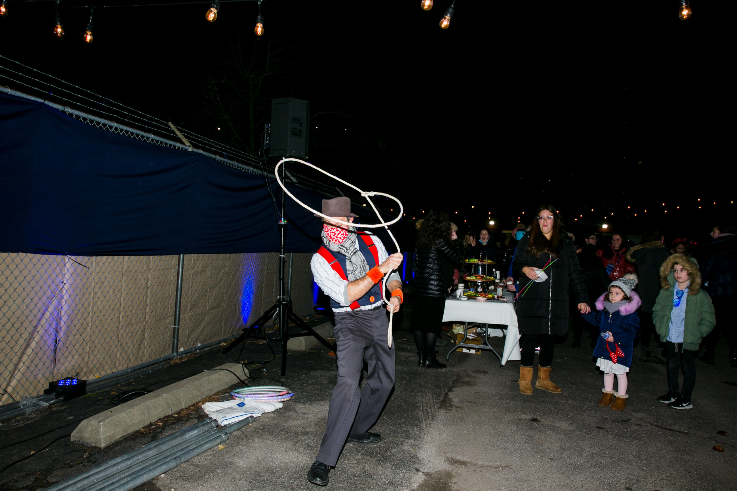 6:00 PM – Go time! The gates open and everyone comes pouring in! Registered? Check. Through the arches, snap a family photo, pick up your goodies. Grab some food and find your friends. Enjoy the cozy music coming from the strolling Shpilkes band (tuba, clarinet, banjo, and accordion). Watch a mind-blowing performance from a fantastic fire juggler or trick roper.
