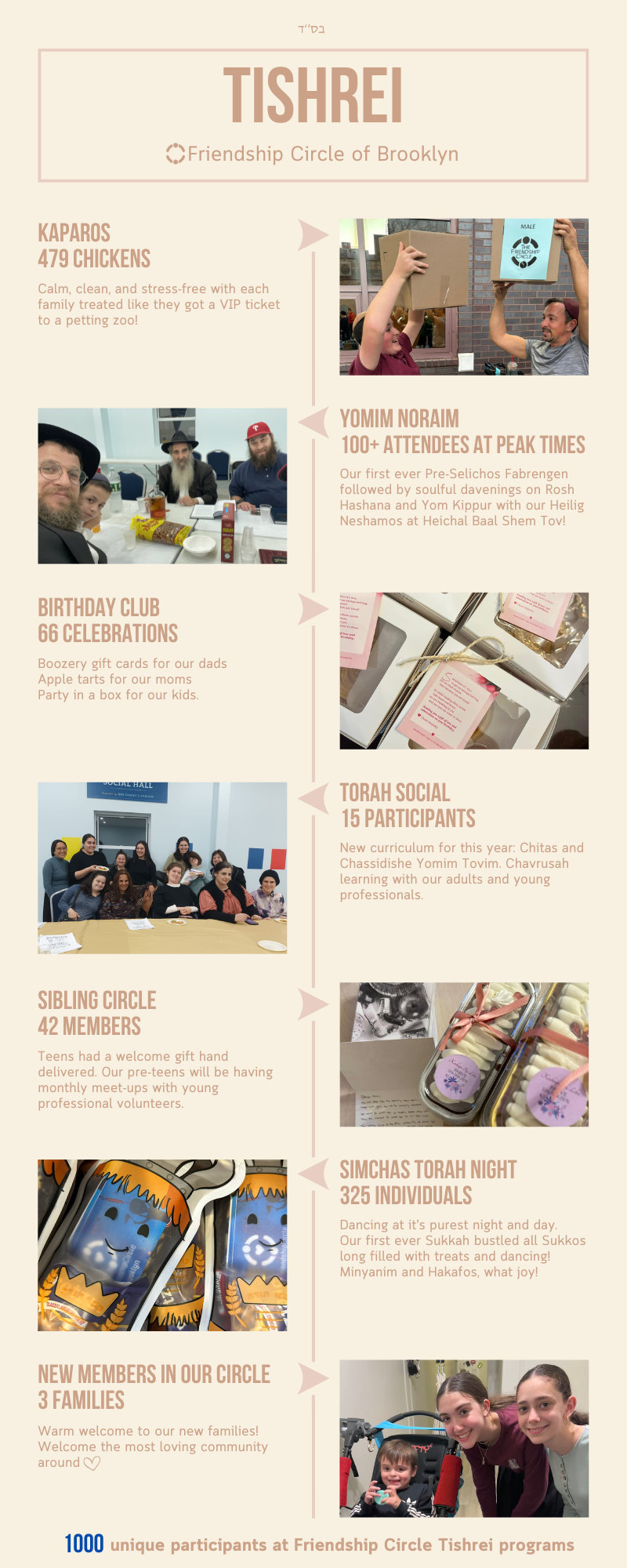 “If a family needs help getting to Shul to hear the Shofar, I’m happy to help. Let me know.” Prior to Rosh Hashana, an alumna volunteer offered her assistance, asking if a family needs help attending Shul for the Shofar blowing. Arrangements were made, and she accompanied the mother, stroller, and son (in a wheelchair) to Shul, enabling the six-year-old boy’s first-ever Rosh Hashana Shul experience. Although he is young, you can clearly see how his soul is deeply connected to this G-dly energy. He hears the Shofar, takes part in Birchas Kohanim (priestly blessing), his face glowing.